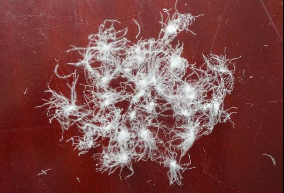 ▲羽絨金網在市場上獲得的“膠水絨”樣品,從外觀來看,“膠水絨”沒有羽絨的自然形態(tài),大多粘連在一起,容易粘附在袋子、蓬松儀側壁上,“膠水絨”檢測時蓬松度符合標準很大程度是這個原因:粘附在容器壁上的“膠水絨”阻礙了鋁質壓板的下沉。